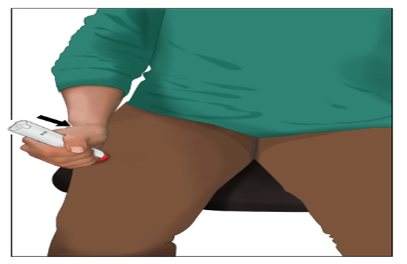 5. ავტოინჯექტორის წვერი მყარად დააჭირით გარედან ბარძაყს, რათა ნემსმა შეძლოს ტანსაცმელში გავლა.