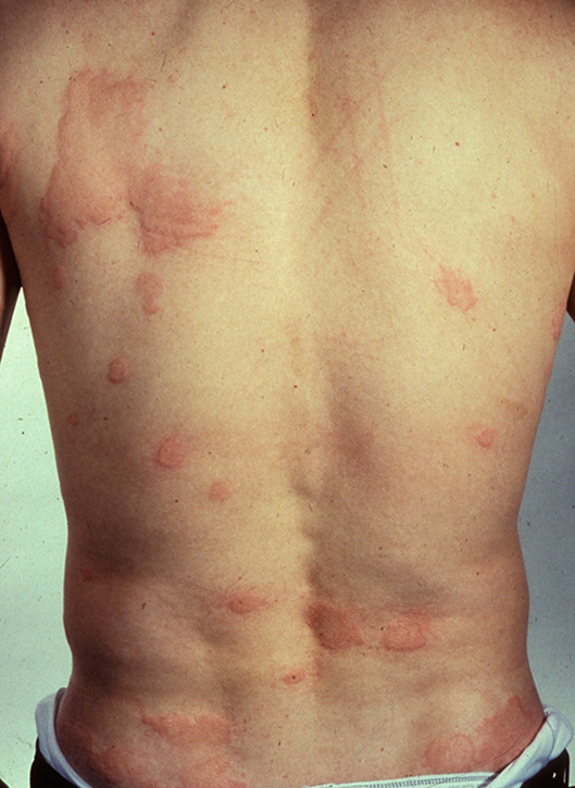 სურათი 1. პაციენტი რომელსაც აღენიშნება მრავლობითი ურტიკარიული გამონაყარი.