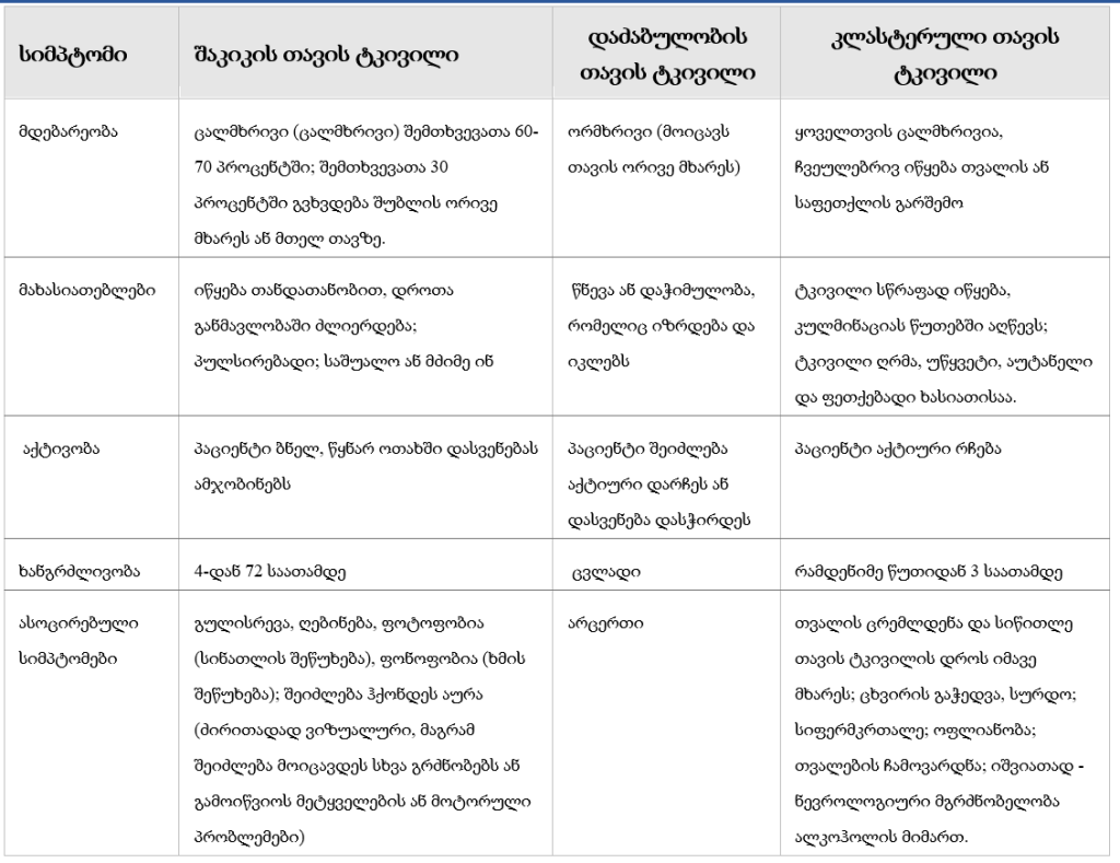 ● თავის ტკივილი, როგორც წესი, ღრმა, აუტანელი, უწყვეტი და ფეთქებადი ხასიათისაა, თუმცა ზოგჯერ შეიძლება იყოს პულსირებადი და მფეთქავი.