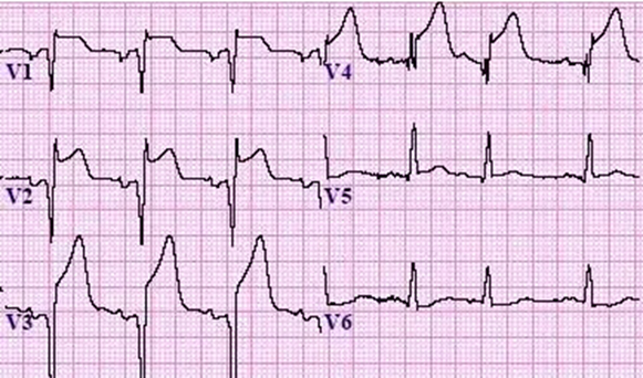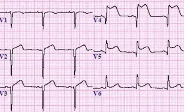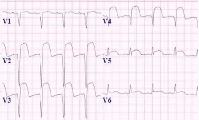 V3 განხრაში ST სეგმენტი აღწევს 5 მმ-მდე, ასევე ლატერალურადაც ფიქსირდება მცირედი ელევაციები V5 და V6 განხრებში.