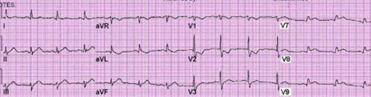 ეს არის იგივე პაციენტის ეკგ, რომელსაც აქვს უკანა ეკგ ჩანაწერი . დამატებულია V7-დან V9 განხრები. V1 და V2 განხრებმა ცოტათი გადაინაცვლეს. უკანა კერებში ST სეგმენტის ელევაცია თითქმის 1 მმ-ც არ არის, მაგრამ მაინც ჩანს მცირე ელევაცია.