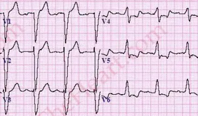 კარგი იქნებოდა მეტი თვალსაჩინოებისთვის ST დეპრესიის ნახვა V2-ში, მაგრამ არის რამდენიმე. გაითვალისწინეთ, რომ R/S თანაფარდობა V1-ში საკმაოდ მაღალია.