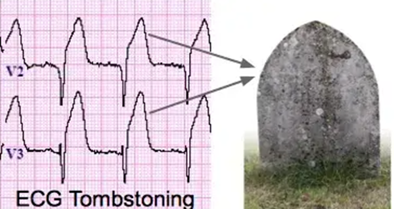 J წერტილი აწეულია და T კბილთან ერთად ეკგ-ზე ისე გამოიყურება, თითქოს საფლავის ქვა იყოს გამოსახული (“Tombstoning”). წინა კედლის ინფარქტისას, როდესაც შეინიშნება ასეთი “საფლავის ქვის ფორმა”, ST სეგმენტის ელევაცია ხშირად შეადგენს 4-დან 6 მმ-ს.