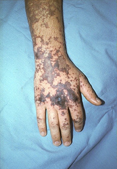 გამონაყარი – დისკრეტული დაზიანებების სახით, უმეტესად ტანისა და სხეულის ქვედა ნაწილებზე ჩნდება 1-დან 2 მმ დიამეტრის პეტექიური გამონაყარი. რბილი სასის, თვალის და ქუთუთოების კონიუნქტივის ლორწოვანი გარსები გულდასმით უნდა შემოწმდეს სისხლდენის ნიშნებზე. პაციენტების 50 პროცენტზე მეტს ექნება პეტეიქიები [2,8]. პეტექიები შეიძლება გაერთიანდეს უფრო დიდ პურპურულ და ექიმოზურ დაზიანებებში გადაიზარდოს (სურათი B, სურათი C).