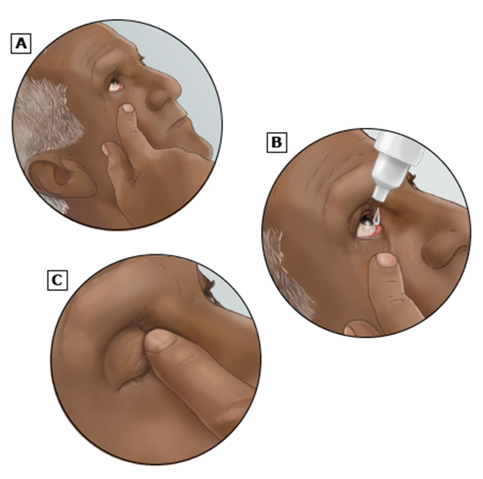 ●მეორე ხელით ჩაისხით თვალში წვეთების დანიშნული რაოდენობა. არ შეეხოთ მედიკამენტის ფლაკონის წვერს და მოარიდეთ თვალის ზედაპირთან კონტაქტს.