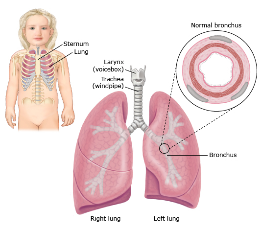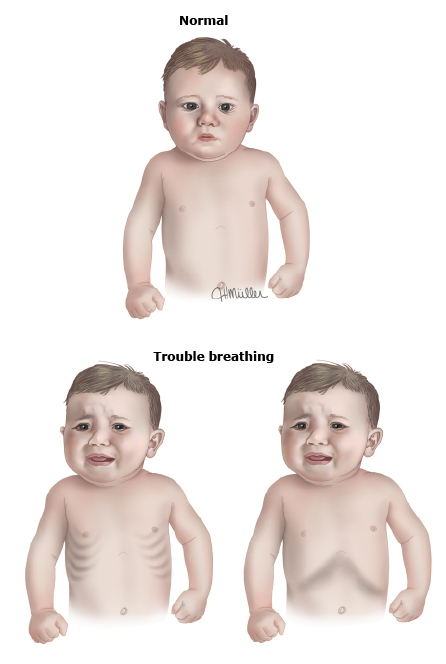 ●კანი და კუნთები მათ ნეკნებს შორის ან ნეკნების ქვემოთ ისე გამოიყურება, თითქოს ისინი ჩაზნექილია (ეს მიუთითებს რომ გაზრდილია სუნთქვაზე დახარჯული ძალისხმევა) (სურათი 2).