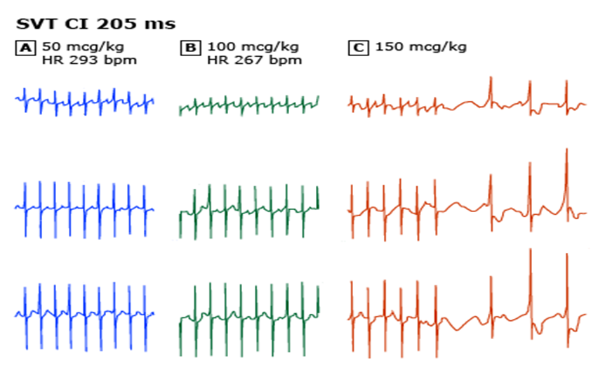 ეფექტურობა და მოქმედების მექანიზმი – ადენოზინის ეფექტურობა ბავშვებში SVT -ს გადაუდებელი მკურნალობისთვის დადასტურებულია რეტროსპექტრული შემთხვევების სერიებით[8,18,20,25,30-32]. ხელმისაწვდომ ანგარიშებში, მან აღმოფხვრა AVRT-ის ეპიზოდები 80-დან 95%-მდე შემთხვევაში, რაც შეადგენს SVT-ის ეპიზოდებით თითქმის სამ მეოთხედს და ეპიზოდების დაახლოებით 75%-ს SVT-ის სხვა მიზეზებში. შეწყვეტის შემდეგ SVT-ის ადრეული განმეორება ხდება შემთხვევების 25-30%-ში. მიუხედავად იმისა, რომ ბავშვებში საკმარისი კლინიკური კვლევები არ არის ჩატარებული, კვლევებმა მოზრდილებში აჩვენა, რომ ადენოზინის ეფექტურობა ЅVТ-ის შეწყვეტისას შედარებულია ვერაპამილის ეფექტურობასთან[33]. ბავშვებში, ადენოზინს ენიჭება უპირატესობა ვერაპამილთან შედარებით, მისი მოქმედების ძალიან მოკლე ხანგრძლივობის გამო და იმის გამო, რომ არსებობს რამდენიმე პარამეტრი, რომლის დროსაც ვერაპამილი არ უნდა იქნეს გამოყენებული (მაგ., ჩვილები <12 თვემდე), როგორც ეს ქვემოთ იქნება განხილული.