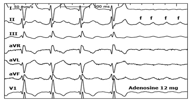 ●ტაქიარითმია შეიძლება გამოწვეული იყოს ალტერნატიული მექანიზმით, როგორიცაა წინაგულების ექტოპიური ტაქიკარდია (AET) ან წინაგულების თრთოლვა. ეკგ-ს ჩანაწერი ადენოზინის მიღების დროს შეიძლება იყოს დიაგნოსტიკურად სასარგებლო ამ შემთხვევებში (ტალღის ფორმა 3). AET და წინაგულების თრთოლვის მართვა სცილდება ამ თემის მიმოხილვის ფარგლებს. რეკომენდებულია ბავშვთა კარდიოლოგთან კონსულტაცია.