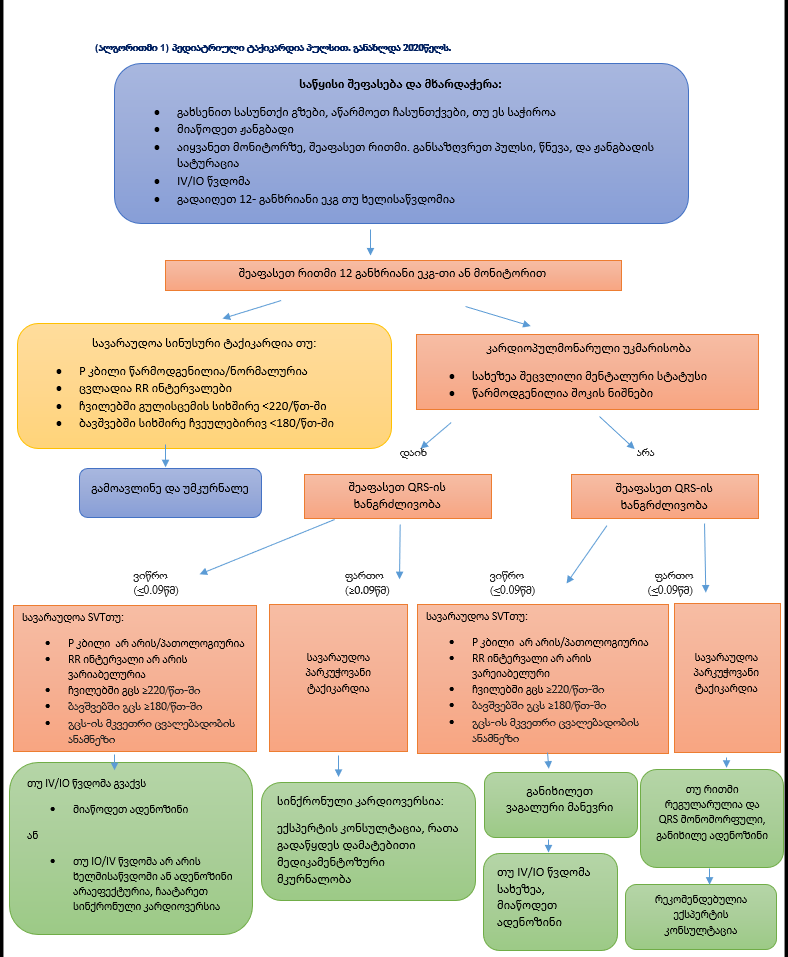 აქ აღწერილი დისკუსიები, ეყრდნობა 2010 წლის PALS-ის გაიდლაინებს, რომელებიც შემუშავებულია ამერიკის გულის ასოციაციის (AHA) და ILCOR-ის მიერ. (ალგორითმი 1) [2]. AHA-ს და ILCOR-ის გაიდლაინები განახლდა 2015 წელს. ხოლო ტაქიარითმიების გაიდლაინები უცვლელია. [3].
