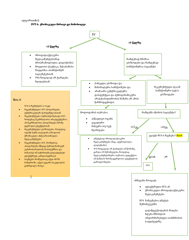 ●ბავშვები ≥15 კგ – ბავშვებში, რომელთა წონაა ≥15 კგ, რეკომენდირებულია RFΑ-ს და არა ქრონიკული ანტიარითმული მედიკამენტებით თერაპია. RFΑ არის ეფექტური მკურნალობა SVT-ის უმეტესობისთვის და ის თავიდან აგვაცილებს ქრონიკული ფარმაკოლოგიური თერაპიის არასასურველ ეფექტებს.